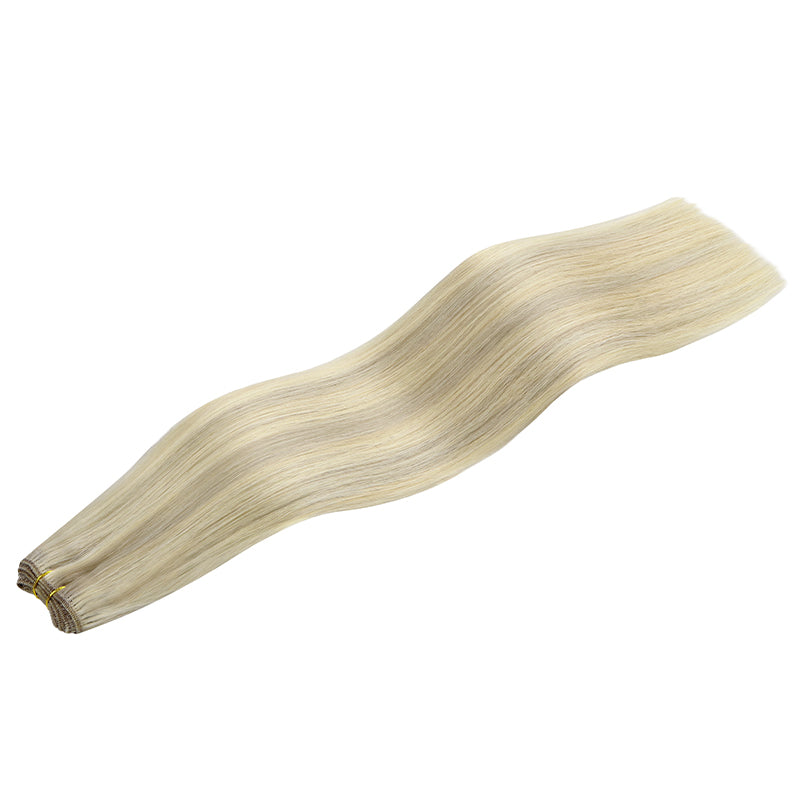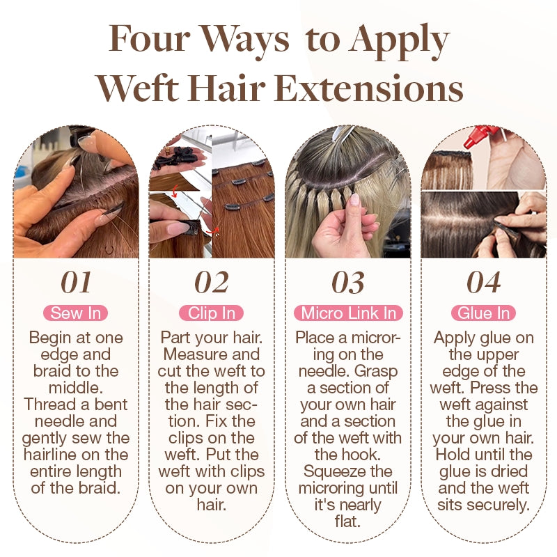 DESCRIPTION Transform your look with GOO GOO Hair Weft Hair Extensions, crafted from premium quality human hair. Our extensions offer a seamless and glamorous solution for adding length and volume to your natural locks. Available in a range of lengths from 14 to 22 inches, these extensions blend effortlessly with your own hair, creating a flawless and natural appearance. Elevate your style and turn heads with GOO GOO Hair Weft Hair Extensions – the ultimate secret to irresistible, show-stopping hair. –100% human remy hair – can be re-applied –Easy to apply in under 30 minutes –Long-lasting Durability, USA-made adhesive long-lasting to 6 months –NON-damaging, lightweight, and comfortable in the hair –Versatile styling options, can be curled, straightened, and styled –Suitable for all hair types WEIGHT LENGTH TOTAL PIECES 80G 14” 1 100G 16” 1 100G 18” 1 100G 20” 1 110G 22” 1 VIDEO TUTORIAL How to wear sew in weft hair extensions? Step 1- Hair extensions must be applied to washed clean hair. Part your hair in desired area where extension needs to be applied. Step 2- Divide your hair into sections horizontally from ear to ear, creating a top and bottom section. Clip the top section away to keep it separate. Step 3- Take a thin section of your natural hair from the bottom section and braid it tightly against your scalp. This serves as the foundation for sewing in the extensions. Step 4- Measure the weft hair extension against the back of your head, from one side to the other. Cut the weft to match the width of the section, leaving a small amount of extra space on each end. Step 5- Thread a needle with a strong, matching thread. Starting at one end of the weft, sew through the weft and the braided section of your hair, going from one side to the other. Secure the weft by looping the thread around the braid and knotting it tightly. Repeat this process along the entire width of the weft, sewing it securely to your braids. Step 6- Please Note: Take care of your sew-in hair extensions by washing and conditioning them regularly using mild, sulfate-free products. Avoid excessive heat styling and use heat protectant products to prolong the lifespan of the extensions. Three Different Ways to Install: How to Remove Weft Hair Extensions? Step 1- Gather a pair of small scissors, a seam ripper, and a wide-toothed comb. These tools will help you safely remove the sew-in extensions. Step 2- Begin by identifying the thread used to sew in the extensions. It is usually a different color from your natural hair and may be visible near the roots of the extensions. Using the small scissors or seam ripper, carefully cut the thread along the weft of the extensions. Take your time to avoid cutting your natural hair. Step 3- Once the thread is cut, gently pull the weft away from your natural hair, starting from one end and working your way to the other. If the weft is tightly sewn, use the seam ripper to carefully undo the stitching. Step 4- After removing each weft, use a wide-toothed comb to gently detangle any knots or tangles that may have formed during the removal process. Start from the ends and work your way up to the roots. How To Wash Comb your hair with a wide-tooth comb. Wash your hair extensions with warm water and sulfate free conditioner. Wash your hair by holding gently. Do not rub your hair. Comb your hair extensions with a wide-tooth comb from the bottom to the top of the hair extensions. Gently hold the hair with your hand and squeeze the water. Beat the hair with a towel until the hair is dry. Kindly Reminder: Please do not use colored shampoos (such as purple shampoo), to wash very light colored hair extensions. Because this may stain the hair extensions. SHIPPING & RETURNS Free Shipping Worldwide. All prices on the website include FREE standard shipping to applicable countries. You can exchange or refund your order within 30 days. *Hope you could understand that if your order is out of stock in the warehouse, we will ship it directly from the factory. Usually takes 3-5 business days to deliver. FAQ 1. Is GOO GOO hair 100% human hair? Yes, GOO GOO Hair is made from 100% remy human hair. We take pride in providing our customers with high-quality hair extensions that are sourced ethically and made from genuine human hair. Our hair extensions undergo a rigorous process to ensure that they are of the highest standard.2. Can I dye/color my Weft Hair Extensions?Human hair can be coloured, but we do not recommend it. Any colouring of the hair extensions is done entirely at your own risk. GOO GOO will not accept any liability for hair extensions that have been coloured or tinted.3. Can I heat my Weft Hair Extensions?Keep in mind that use of heat styling and other hair products will cause damage to your extensions over time. Do not leave on heat for extended time periods, extensions can burn just like your own hair.