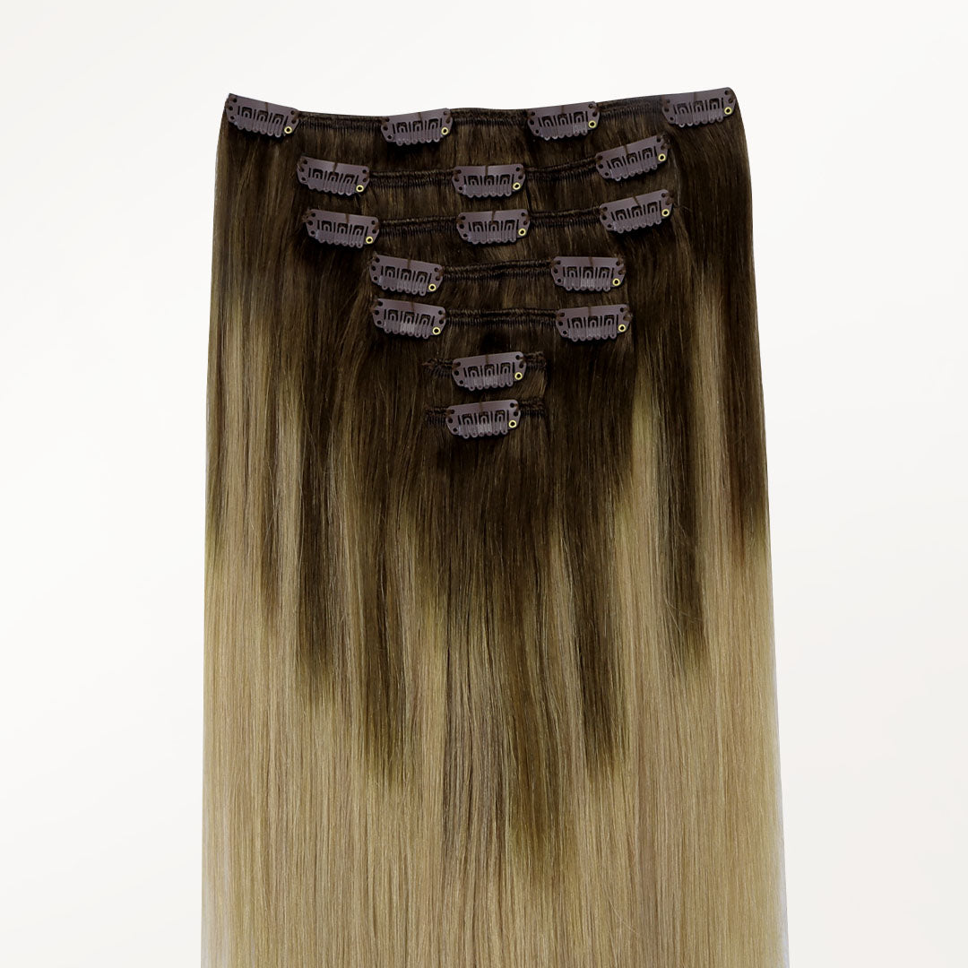 DESCRIPTION –Fuller, longer hair instantly –100% Remy Human Hair –Easy to clip in –Multiple lengths & shades –Heat safe and holds curls –Perfect for all hair type 120G Clip-In Set Includes: 1PC 5-Clip Weft – 8 Inch 2PCS 4-Clip Wefts – 6 Inch 2PCS 2-Clip Wefts – 4 Inch 2PCS 1-Clip Wefts – 2 Inch WEIGHT LENGTH TOTAL PIECES 120G 14”16”18”20”22”24” 7 GOO GOO Hair clip-in hair extensions are the perfect solution for those who want longer, fuller, more beautiful hair instantly. Our hair extensions are easy to clip-on in just minutes, without the hassle of glues, tapes or weaves. There is no commitment, wear them as often as you like. They are easy to use, we have a wide color selection. GOO GOO Hair Clip In Hair Extensions are luxurious extensions that have specially designed small clips with a unique silicone strip that won’t damage your natural hair or scalp. This allows them to stay securely in place without need for hairspray or teasing of your natural hair, even if you have fine or thin hair in most cases. Because all of our extensions are only made with real human hair, they can be washed, styled, blow dried, flat ironed, and/or curled using hot tools, just like your own hair. TUTORIAL How to wear clip in hair extensions? Step 1- Separate your hair: Starting at the lower back section of your head, use a tail comb or index finger to divide(horizontally part)your hair, at the lower back of the head i.e. just below one ear to the second ear. Also, you can start parting even lower, as low as you want to place the first weft. Step 2- Choose a suitable width clip hair and open the clips that are sewed on the weft. Step 3- Prepare the hair wefts and wear on your hair, then check if wear firm. Step 4- Release the hair you held out of the way and create a new parting. Repeat the first to third steps to wear on the other side of the head. Each time leave the extra hair, on top of your head. Step 5- After wear all hair pieces put your hair down and comb neatly. You will have a good looking in an instant. How To Wash Clip in Hair Extensions Comb your hair with a wide-tooth comb. Wash your hair extensions with warm water and sulfate free conditioner. Wash your hair by holding gently. Do not rub your hair. Comb your hair extensions with a wide-tooth comb from the bottom to the top of the hair extensions. Gently hold the hair with your hand and squeeze the water. Beat the hair with a towel until the hair is dry. Kindly Reminder: Please do not use colored shampoos (such as purple shampoo), to wash very light colored hair extensions. Because this may stain the hair extensions. SHIPPING & RETURNS Free Shipping Worldwide. All prices on the website include FREE standard shipping to applicable countries. You can exchange or refund your order within 30 days.