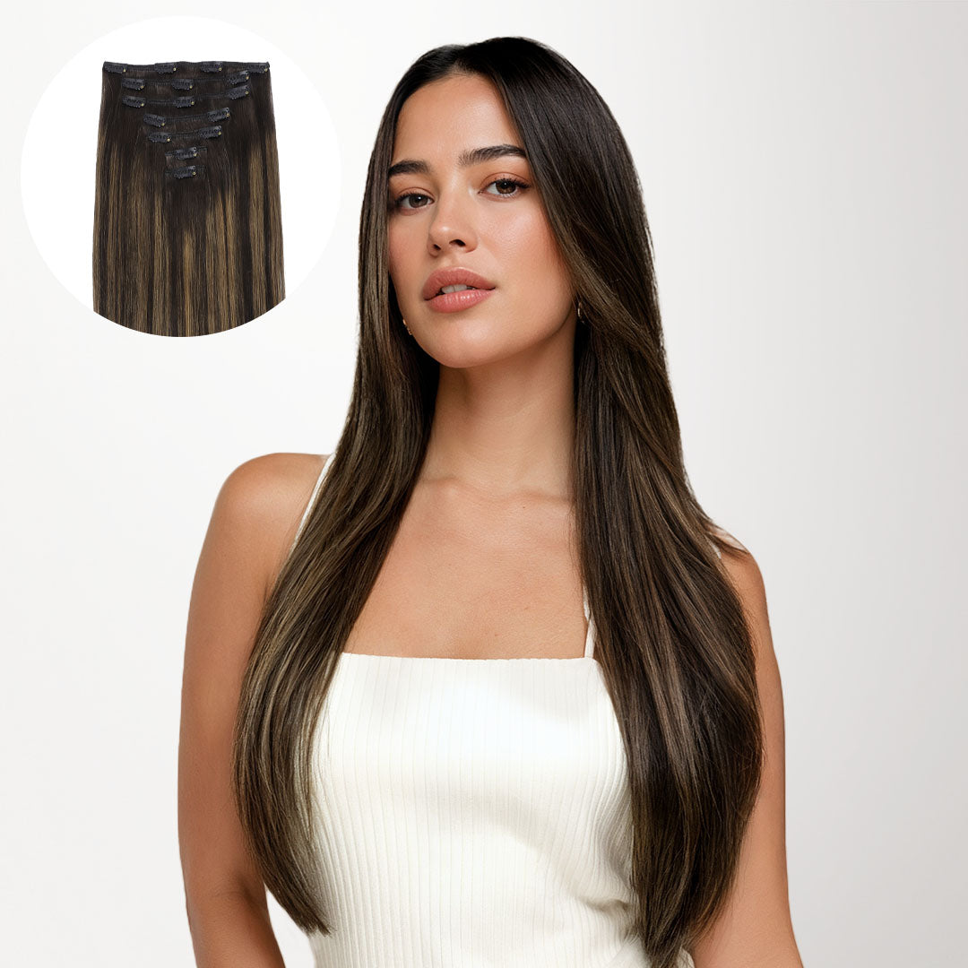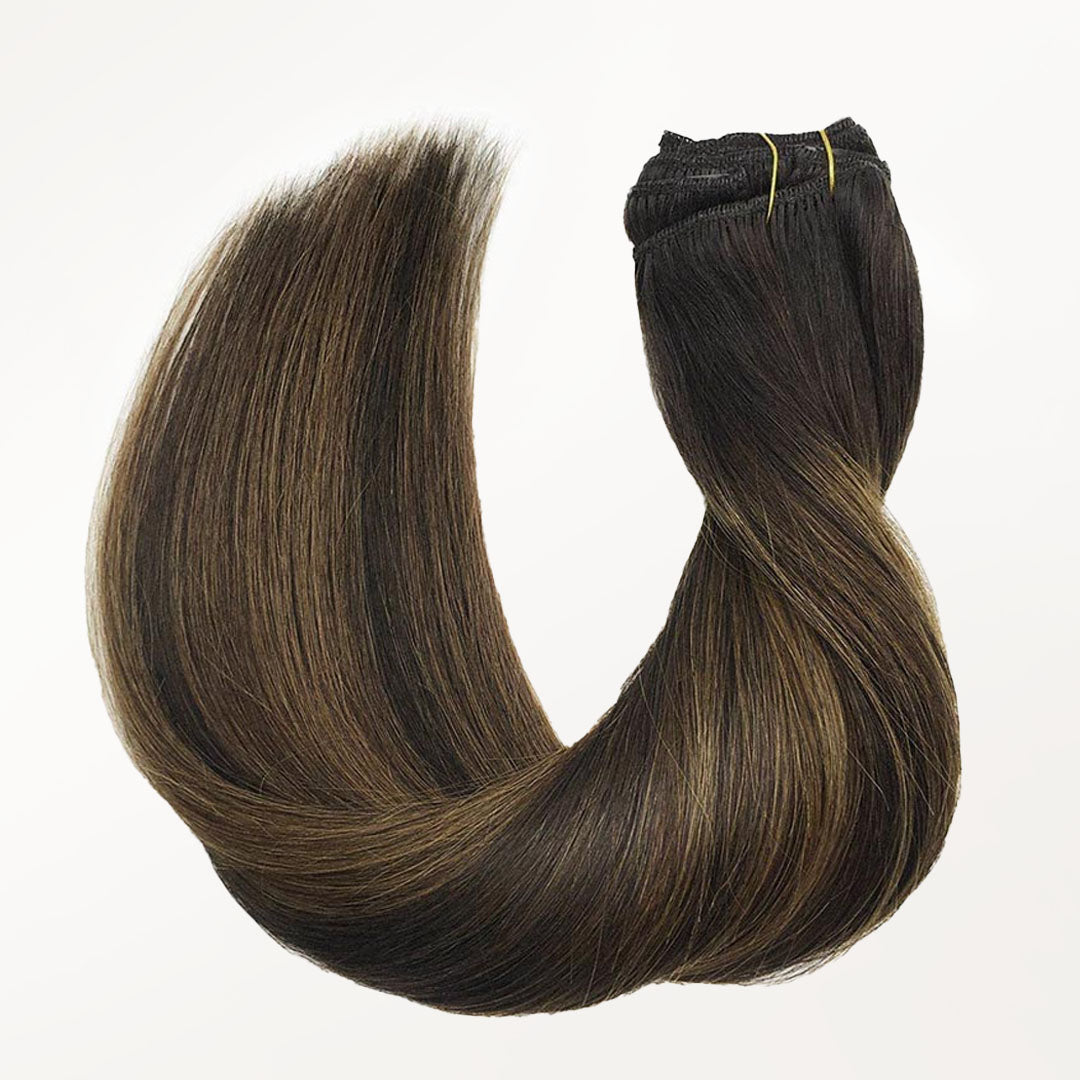 DESCRIPTION –Fuller, longer hair instantly –100% Remy Human Hair –Easy to clip in –Multiple lengths & shades –Heat safe and holds curls –Perfect for all hair type 120G Clip-In Set Includes: 1PC 5-Clip Weft – 8 Inch 2PCS 4-Clip Wefts – 6 Inch 2PCS 2-Clip Wefts – 4 Inch 2PCS 1-Clip Wefts – 2 Inch 150G Clip-In Set Includes: 1PC 5-Clip Weft (8 Inch) 2PCS 4-Clip Wefts (6 Inch) 4PCS 2-Clip Wefts (4 Inch) 2PCS 1-Clip Wefts (2 Inch) WEIGHT LENGTH TOTAL PIECES 120G 14” 16” 18” 20” 22” 24” 7 150G 22″ 24″ 9 GOO GOO Hair clip-in hair extensions are the perfect solution for those who want longer, fuller, more beautiful hair instantly. Our hair extensions are easy to clip-on in just minutes, without the hassle of glues, tapes or weaves. There is no commitment, wear them as often as you like. They are easy to use, we have a wide color selection. GOO GOO Hair Clip In Hair Extensions are luxurious extensions that have specially designed small clips with a unique silicone strip that won’t damage your natural hair or scalp. This allows them to stay securely in place without need for hairspray or teasing of your natural hair, even if you have fine or thin hair in most cases. Because all of our extensions are only made with real human hair, they can be washed, styled, blow dried, flat ironed, and/or curled using hot tools, just like your own hair. TUTORIAL How to wear clip in hair extensions? Step 1- Separate your hair: Starting at the lower back section of your head, use a tail comb or index finger to divide(horizontally part)your hair, at the lower back of the head i.e. just below one ear to the second ear. Also, you can start parting even lower, as low as you want to place the first weft. Step 2- Choose a suitable width clip hair and open the clips that are sewed on the weft. Step 3- Prepare the hair wefts and wear on your hair, then check if wear firm. Step 4- Release the hair you held out of the way and create a new parting. Repeat the first to third steps to wear on the other side of the head. Each time leave the extra hair, on top of your head. Step 5- After wear all hair pieces put your hair down and comb neatly. You will have a good looking in an instant. How To Wash Clip in Hair Extensions Comb your hair with a wide-tooth comb. Wash your hair extensions with warm water and sulfate free conditioner. Wash your hair by holding gently. Do not rub your hair. Comb your hair extensions with a wide-tooth comb from the bottom to the top of the hair extensions. Gently hold the hair with your hand and squeeze the water. Beat the hair with a towel until the hair is dry. Kindly Reminder: Please do not use colored shampoos (such as purple shampoo), to wash very light colored hair extensions. Because this may stain the hair extensions. SHIPPING & RETURNS Free Shipping Worldwide. All prices on the website include FREE standard shipping to applicable countries. You can exchange or refund your order within 30 days.