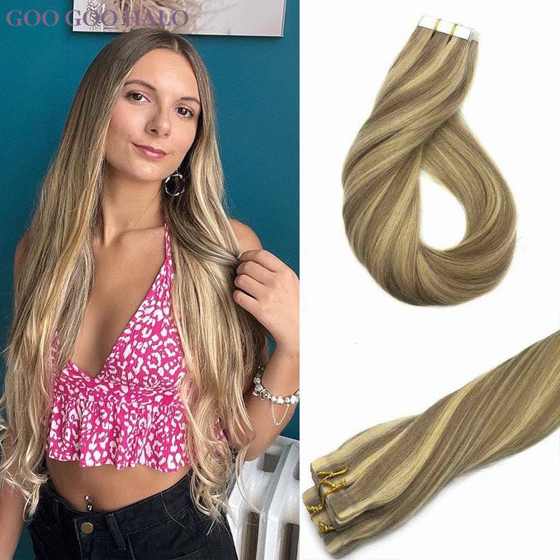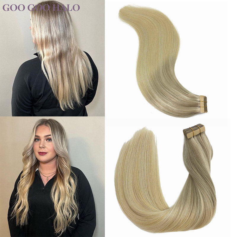DESCRIPTION GOO GOO HALO Tape in Hair Extensions are designed to be quick to install, easy to remove, and simple re-apply, we use discreet and lightweight tape adhesive tabs. Once fitted GOO GOO HALO tape in hair extensions should last between 8-10 weeks before needing to be re-positioned. With our tape in hair extensions human hair, you can achieve any style you like, whether you want a sleek ponytail or a full body blowout. You can also wash, cut, and dye tape in hair extensions just like your own hair. And, as well as their versatility, style and ease, GOO GOO HALO hair tape in hair extensions are the least damaging type of semi-permanent extensions and are very discreet as they lay flat to your head. –100% human remy hair – can be re-applied –Easy to apply in under 30 minutes –High quality,USA-made adhesive holds up to 8 weeks –Double Sided Tape–More Strong and Durable –NON-damaging, lightweight, and comfortable in the hair –3-4 packs to add the length, 2-3 packs to add the thickness. –Suitable for all hair types WEIGHT LENGTH TOTAL PIECES 50G 14” 16” 18” 20” 22” 24” 20 (Date First Available Dec 01, 2021) How to Wear tape in Hair Extensions? Step 1- Hair extensions must be applied to washed clean hair. Part your hair in desired area where extension needs to be applied. Step 2- Rip off the cover on the tape extension to expose the super tape. Line up extension directly and attach by pressing to piece of desired hair. Step 3- Double the thickness by adding another layer to the underneath of the piece. Step 4- Two sticky sides face each other and the section of hair will be in the middle. Like a sandwich. Step 5- Please Note: Once hair is in, use your flat iron on a low heat setting. Please control the temperature within 350 degrees Fahrenheit. (Please don’t use too high temperature, because that may cause the tape to melt.) Then heating the tapes 5-6s one time, repeating 5-6 times. You are finished! Your hair is now thick and seamless. How to Remove tape in Hair Extensions? Step 1- Use with a professional product for taking out the tapes on the contact part of the hair and tape. Step 2- Wait for one minute, gently peel off the tape. (Don’t tear the tape too hard, because that might damage your own hair.) Step 3- Then you can wash your own hair to keep your hair clean and you could replace with new tapes. How To Wash Comb your hair with a wide-tooth comb. Wash your hair extensions with warm water and sulfate free conditioner. Wash your hair by holding gently. Do not rub your hair. Comb your hair extensions with a wide-tooth comb from the bottom to the top of the hair extensions. Gently hold the hair with your hand and squeeze the water. Beat the hair with a towel until the hair is dry. Kindly Reminder: Please do not use colored shampoos (such as purple shampoo), to wash very light colored hair extensions. Because this may stain the hair extensions. SHIPPING & RETURNS Free Shipping Worldwide. All prices on the website include FREE standard shipping to applicable countries. You can exchange or refund your order within 30 days.
