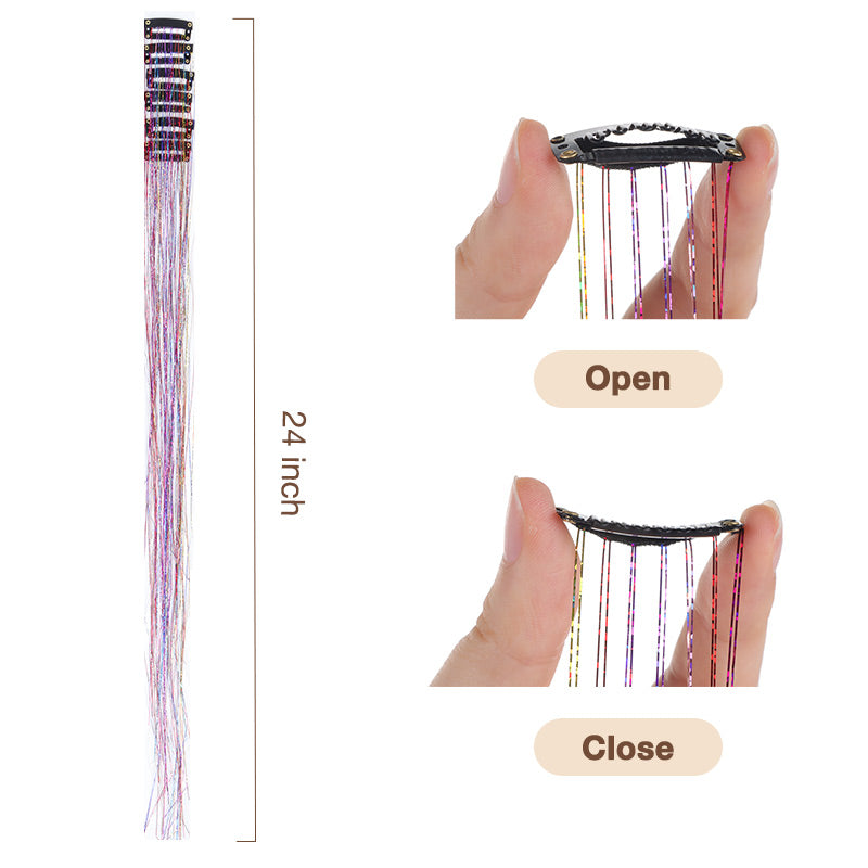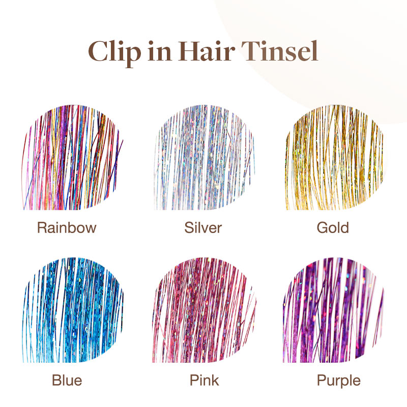 One pack 6 pcs Tinsel Clip ins. Clip in tinsel hair extensions are made of 100% durable polyester fiber No bad smell, non toxic, hair quality soft, light and super smooth. Silk Feeling, no tangles,no shedding. Clip into a ponytail,wrap around a bun,weave into a pigtail — the perfect hair accessory for girls of all ages. Daily hairdressing, party, birthday, festival, bar carnival, decoration, sparkling tinsel hair extensions make you the focus of the audience. you sleep. Perfect for any hair type and length, it’s easy to use and gives you amazing results. *Please note due to hygiene reasons this item cannot be returned, unless faulty.