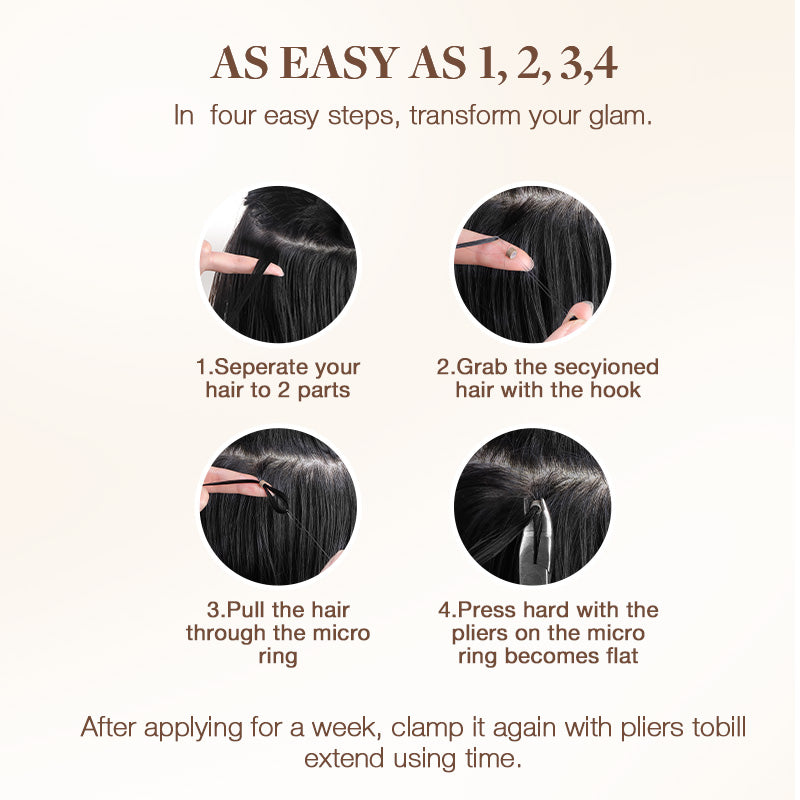 DESCRIPTION High Quality Remy Hair: I tip hair extensions are made of 100% remy human hair, the high quality help to reduce tangling and gives the hair a natural look and feel. The service life is 3-4 months longer than ordinary hair. High Quality Italian Keratin Tip:-Durability: Italian keratin is known for its superior quality and durability. It doesn’t break down easily, ensuring that the extensions stay in place for an extended period.-Gentle on Hair: Italian keratin is gentle on natural hair, reducing the risk of damage when applied or removed properly. Length Weight Quantity Wearing Tools 14″-16″ 50g 100strands/pack (Total 1 pack) Total 120 beads 18″-24″ 50g 50strands/pack (Total 1 pack) Total 60 beads 14″-16″ 100g 100strands/pack (Total 2 packs) Total 240 beads 18″-24″ 100g 50strands/pack (Total 2 packs) Total 120 beads I Tip hair extensions do not require heat or glue, but use micro-bead technology; Simply clamp them gently with pliers to enjoy long-lasting and strong results without causing any damage to your natural hairTo maintain the best results, we recommend re-clamping the micro-beads every 4-6 weeks to extend the life. Kindly Note: Due to different monitors and lights, the actual item you receive may have a slight color difference, which is normal. If you are indecisive about how to choose a matched color, please contact us directly. VIDEO TUTORIAL 1.How to install I Tip hair extensions? Tools You’ll Need:Beads or micro rings (silicone-lined are preferred for better grip)Pliers (for securing the beads)Loop tool or pulling needleSectioning clipsComb (for sectioning and parting the hair)Step 1-Wash and dry your hair thoroughly. Avoid using conditioner on the roots as it can make the hair too slippery for the beads. And ensure your hair is tangle-free by brushing it. Step 2-Divide your hair into sections, starting from the bottom and working your way up. Use clips to hold the upper sections in place. Take a small section of hair where you want to install the extension. Step 3-Take a small section of hair where you want to install the extension. Thread the small section of your natural hair through the loop tool, then pull it through the bead, sliding the bead close to the scalp. Step 4-Insert the I-tip extension into the bead alongside your natural hair. Make sure the tip is secure inside the bead. Step 5-Using the pliers, clamp down on the bead to secure it in place. Ensure it’s tight enough to hold but not too tight to cause discomfort. Step 6-Gently brush your hair to blend the extensions with your natural hair. Style as desired. 2.How to remove I Tip hair extensions?Step 1-Gather the Necessary Tools: Pliers and Fine-tooth Comb. Step 2-Locate the Beads: Find the microbeads that are securing the I-tip extensions to your natural hair. These beads are usually close to the scalp. Step 3-Loosen the Beads: Using the pliers, gently squeeze the bead in the opposite direction of how it was originally flattened. This will open the bead and release the extension. Step 4-Remove the Extensions: Once the bead is open, carefully slide the I-tip extension out of your natural hair. Step 5-Comb Through Your Hair & Wash and Condition: Use a fine-tooth comb to gently detangle your hair and remove any leftover residue, wash and condition your hair. 3.How To Wash Comb your hair with a wide-tooth comb. Wash your hair extensions with warm water and sulfate free conditioner. Wash your hair by holding gently. Do not rub your hair. Comb your hair extensions with a wide-tooth comb from the bottom to the top of the hair extensions. Gently hold the hair with your hand and squeeze the water. Beat the hair with a towel until the hair is dry. Kindly Reminder: Please do not use colored shampoos (such as purple shampoo), to wash very light colored hair extensions. Because this may stain the hair extensions. SHIPPING & RETURNS Free Shipping Worldwide. All prices on the website include FREE standard shipping to applicable countries. You can exchange or refund your order within 30 days. *Hope you could understand that if your order is out of stock in the warehouse, we will ship it directly from the factory. Usually takes 3-5 business days to deliver. FAQ 1. Is GOO GOO hair 100% human hair? Yes, GOO GOO Hair ismade from Remy human hair, which means that the hair cuticles are intact and aligned in the same direction. This reduces tangling and gives the hair a natural look and feel. Our hair extensions undergo a rigorous high-temperature disinfection process with no chemical treatment to ensure they meet the highest standards. 2.How many pieces from I Tip Hair Extensions come in 1 package?I Tip 14”-16” 100 strands each pack, total 50 grams, give 120 beads; 18”-24” 50 strands each pack, total 50 grams, give 60 beads. 3.How many packages of I Tip Hair Extensions can meet my needs?1-2 packs for a natural looking, if you want thick hair effect, we recommend 3-4 packs for adding volume and length 4.Can I dye/color my I Tip Hair Extensions?Human hair can be coloured, but we do not recommend it. Any colouring of the hair extensions is done entirely at your own risk. GOO GOO will not accept any liability for hair extensions that have been coloured or tinted. 5.Can I heat my I Tip Hair Extensions?Yes, you can apply heat to I-tip hair extensions, but it’s important to do so with caution. Here are some tips:-Use a Heat Protectant: Always apply a heat protectant spray before using any heat styling tools. This helps to minimize damage to the hair. -Avoid the Bonds: When using heat near the roots, be careful not to apply heat directly to the bonds (the point where the extensions are attached to your natural hair). High heat can weaken the bonds, causing the extensions to slip or fall out. -Limit Heat Styling: Try to limit how often you use heat on your extensions to maintain their quality for a longer time.