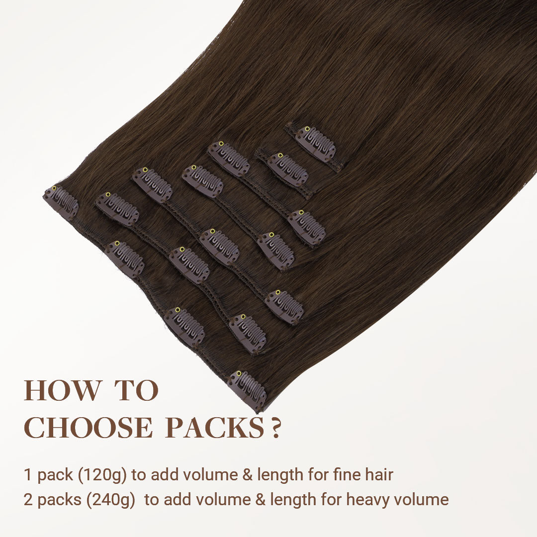 DESCRIPTION –Fuller, longer hair instantly –100% Remy Human Hair –Easy to clip in –Multiple lengths & shades –Heat safe and holds curls –Perfect for all hair type 120G/130G Clip-In Set Includes: 1PC 5-Clip Weft – 8 Inch 2PCS 4-Clip Wefts – 6 Inch 2PCS 2-Clip Wefts – 4 Inch 2PCS 1-Clip Wefts – 2 Inch 150G Clip-In Set Includes: 1PC 5-Clip Weft (8 Inch) 2PCS 4-Clip Wefts (6 Inch) 4PCS 2-Clip Wefts (4 Inch) 2PCS 1-Clip Wefts (2 Inch) WEIGHT LENGTH TOTAL PIECES 120G 14” 16” 18” 20” 22” 24” 7 130G 20″ 7 150G 22″ 24″ 9 GOO GOO Hair clip-in hair extensions are the perfect solution for those who want longer, fuller, more beautiful hair instantly. Our hair extensions are easy to clip-on in just minutes, without the hassle of glues, tapes or weaves. There is no commitment, wear them as often as you like. They are easy to use, we have a wide color selection. GOO GOO Hair Clip In Hair Extensions are luxurious extensions that have specially designed small clips with a unique silicone strip that won’t damage your natural hair or scalp. This allows them to stay securely in place without need for hairspray or teasing of your natural hair, even if you have fine or thin hair in most cases. Because all of our extensions are only made with real human hair, they can be washed, styled, blow dried, flat ironed, and/or curled using hot tools, just like your own hair. TUTORIAL How to wear clip in hair extensions? Step 1- Separate your hair: Starting at the lower back section of your head, use a tail comb or index finger to divide(horizontally part)your hair, at the lower back of the head i.e. just below one ear to the second ear. Also, you can start parting even lower, as low as you want to place the first weft. Step 2- Choose a suitable width clip hair and open the clips that are sewed on the weft. Step 3- Prepare the hair wefts and wear on your hair, then check if wear firm. Step 4- Release the hair you held out of the way and create a new parting. Repeat the first to third steps to wear on the other side of the head. Each time leave the extra hair, on top of your head. Step 5- After wear all hair pieces put your hair down and comb neatly. You will have a good looking in an instant. How To Wash Clip in Hair Extensions Comb your hair with a wide-tooth comb. Wash your hair extensions with warm water and sulfate free conditioner. Wash your hair by holding gently. Do not rub your hair. Comb your hair extensions with a wide-tooth comb from the bottom to the top of the hair extensions. Gently hold the hair with your hand and squeeze the water. Beat the hair with a towel until the hair is dry. Kindly Reminder: Please do not use colored shampoos (such as purple shampoo), to wash very light colored hair extensions. Because this may stain the hair extensions. SHIPPING & RETURNS Free Shipping Worldwide. All prices on the website include FREE standard shipping to applicable countries. You can exchange or refund your order within 30 days.