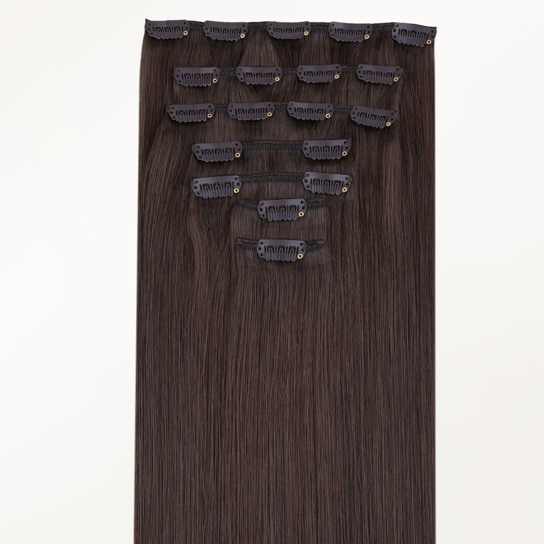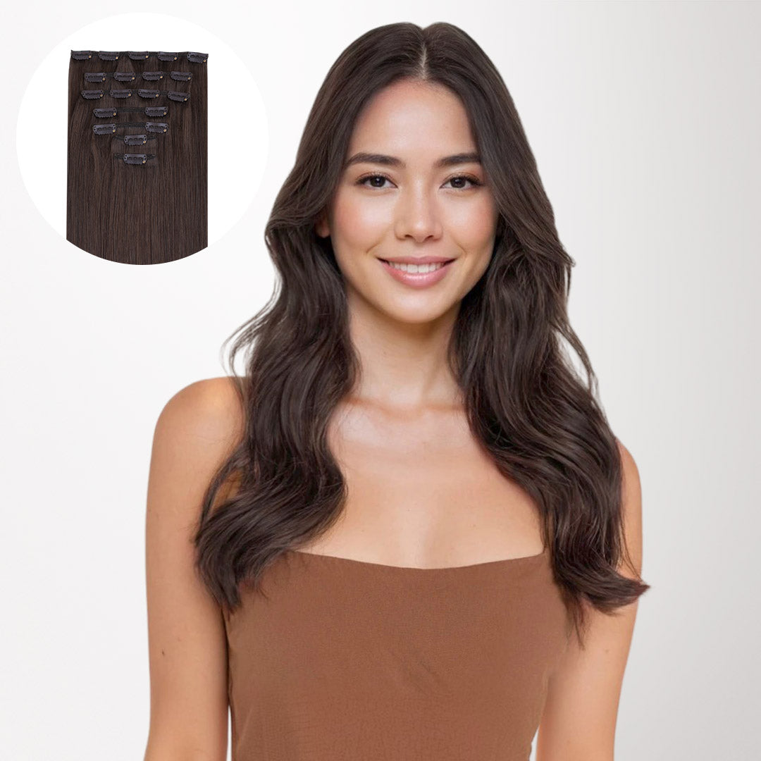 DESCRIPTION –Fuller, longer hair instantly –100% Remy Human Hair –Easy to clip in –Multiple lengths & shades –Heat safe and holds curls –Perfect for all hair type Clip-In Set Includes: One 4-Clip Weft – 8 Inch Two 3-Clip Wefts – 6 Inch Four 2-Clip Wefts – 4 Inch Two 1-Clip Wefts – 2 Inch WEIGHT LENGTH TOTAL PIECES 150G 14” 16” 18” 20” 22” 24” 9 160G 20″ 7 170G 22″ 24″ 7 GOO GOO Hair clip-in hair extensions are the perfect solution for those who want longer, fuller, more beautiful hair instantly. Our hair extensions are easy to clip-on in just minutes, without the hassle of glues, tapes or weaves. There is no commitment, wear them as often as you like. They are easy to use, we have a wide color selection. GOO GOO Hair Clip In Hair Extensions are luxurious extensions that have specially designed small clips with a unique silicone strip that won’t damage your natural hair or scalp. This allows them to stay securely in place without need for hairspray or teasing of your natural hair, even if you have fine or thin hair in most cases. Because all of our extensions are only made with real human hair, they can be washed, styled, blow dried, flat ironed, and/or curled using hot tools, just like your own hair. TUTORIAL How to wear clip in hair extensions? Step 1- Separate your hair: Starting at the lower back section of your head, use a tail comb or index finger to divide(horizontally part)your hair, at the lower back of the head i.e. just below one ear to the second ear. Also, you can start parting even lower, as low as you want to place the first weft. Step 2- Choose a suitable width clip hair and open the clips that are sewed on the weft. Step 3- Prepare the hair wefts and wear on your hair, then check if wear firm. Step 4- Release the hair you held out of the way and create a new parting. Repeat the first to third steps to wear on the other side of the head. Each time leave the extra hair, on top of your head. Step 5- After wear all hair pieces put your hair down and comb neatly. You will have a good looking in an instant. How To Wash Clip in Hair Extensions Comb your hair with a wide-tooth comb. Wash your hair extensions with warm water and sulfate free conditioner. Wash your hair by holding gently. Do not rub your hair. Comb your hair extensions with a wide-tooth comb from the bottom to the top of the hair extensions. Gently hold the hair with your hand and squeeze the water. Beat the hair with a towel until the hair is dry. Kindly Reminder: Please do not use colored shampoos (such as purple shampoo), to wash very light colored hair extensions. Because this may stain the hair extensions. SHIPPING & RETURNS Free Shipping Worldwide. All prices on the website include FREE standard shipping to applicable countries. You can exchange or refund your order within 30 days.