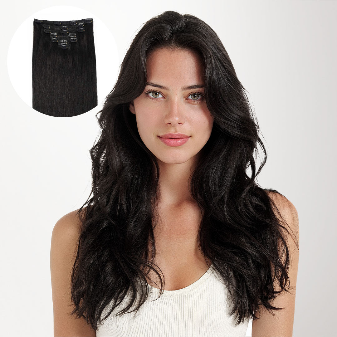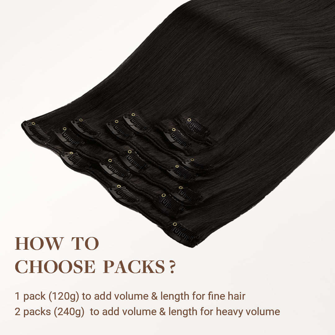 DESCRIPTION –Fuller, longer hair instantly –100% Remy Human Hair –Easy to clip in –Multiple lengths & shades –Heat safe and holds curls –Perfect for all hair type 120G/130G Clip-In Set Includes: 1PC 5-Clip Weft – 8 Inch 2PCS 4-Clip Wefts – 6 Inch 2PCS 2-Clip Wefts – 4 Inch 2PCS 1-Clip Wefts – 2 Inch 150G Clip-In Set Includes: 1PC 5-Clip Weft (8 Inch) 2PCS 4-Clip Wefts (6 Inch) 4PCS 2-Clip Wefts (4 Inch) 2PCS 1-Clip Wefts (2 Inch) WEIGHT LENGTH TOTAL PIECES 120G 14” 16” 18” 20” 22” 24” 7 130G 20″ 7 150G 22″ 24″ 9 GOO GOO Hair clip-in hair extensions are the perfect solution for those who want longer, fuller, more beautiful hair instantly. Our hair extensions are easy to clip-on in just minutes, without the hassle of glues, tapes or weaves. There is no commitment, wear them as often as you like. They are easy to use, we have a wide color selection. GOO GOO Hair Clip In Hair Extensions are luxurious extensions that have specially designed small clips with a unique silicone strip that won’t damage your natural hair or scalp. This allows them to stay securely in place without need for hairspray or teasing of your natural hair, even if you have fine or thin hair in most cases. Because all of our extensions are only made with real human hair, they can be washed, styled, blow dried, flat ironed, and/or curled using hot tools, just like your own hair. TUTORIAL How to wear clip in hair extensions? Step 1- Separate your hair: Starting at the lower back section of your head, use a tail comb or index finger to divide(horizontally part)your hair, at the lower back of the head i.e. just below one ear to the second ear. Also, you can start parting even lower, as low as you want to place the first weft. Step 2- Choose a suitable width clip hair and open the clips that are sewed on the weft. Step 3- Prepare the hair wefts and wear on your hair, then check if wear firm. Step 4- Release the hair you held out of the way and create a new parting. Repeat the first to third steps to wear on the other side of the head. Each time leave the extra hair, on top of your head. Step 5- After wear all hair pieces put your hair down and comb neatly. You will have a good looking in an instant. How To Wash Clip in Hair Extensions Comb your hair with a wide-tooth comb. Wash your hair extensions with warm water and sulfate free conditioner. Wash your hair by holding gently. Do not rub your hair. Comb your hair extensions with a wide-tooth comb from the bottom to the top of the hair extensions. Gently hold the hair with your hand and squeeze the water. Beat the hair with a towel until the hair is dry. Kindly Reminder: Please do not use colored shampoos (such as purple shampoo), to wash very light colored hair extensions. Because this may stain the hair extensions. SHIPPING & RETURNS Free Shipping Worldwide. All prices on the website include FREE standard shipping to applicable countries. You can exchange or refund your order within 30 days.