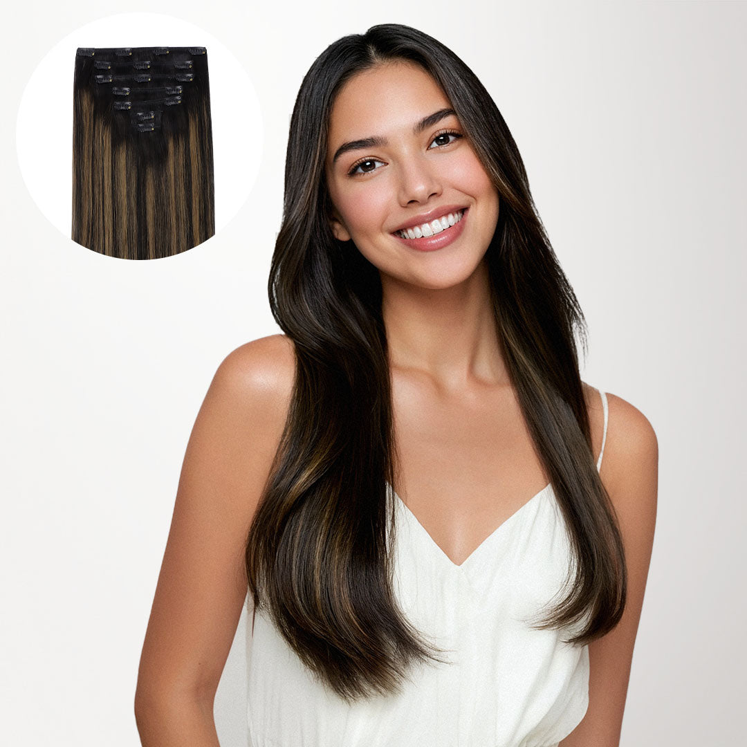 DESCRIPTION –Fuller, longer hair instantly –100% Remy Human Hair –Easy to clip in –Multiple lengths & shades –Heat safe and holds curls –Perfect for all hair type 120G Clip-In Set Includes: 1PC 5-Clip Weft – 8 Inch 2PCS 4-Clip Wefts – 6 Inch 2PCS 2-Clip Wefts – 4 Inch 2PCS 1-Clip Wefts – 2 Inch 150G Clip-In Set Includes: 1PC 5-Clip Weft (8 Inch) 2PCS 4-Clip Wefts (6 Inch) 4PCS 2-Clip Wefts (4 Inch) 2PCS 1-Clip Wefts (2 Inch) WEIGHT LENGTH TOTAL PIECES 120G 14” 16” 18” 20” 22” 24” 7 150g 22″ 24″ 9 GOO GOO Hair clip-in hair extensions are the perfect solution for those who want longer, fuller, more beautiful hair instantly. Our hair extensions are easy to clip-on in just minutes, without the hassle of glues, tapes or weaves. There is no commitment, wear them as often as you like. They are easy to use, we have a wide color selection. GOO GOO Hair Clip In Hair Extensions are luxurious extensions that have specially designed small clips with a unique silicone strip that won’t damage your natural hair or scalp. This allows them to stay securely in place without need for hairspray or teasing of your natural hair, even if you have fine or thin hair in most cases. Because all of our extensions are only made with real human hair, they can be washed, styled, blow dried, flat ironed, and/or curled using hot tools, just like your own hair. TUTORIAL How to wear clip in hair extensions? Step 1- Separate your hair: Starting at the lower back section of your head, use a tail comb or index finger to divide(horizontally part)your hair, at the lower back of the head i.e. just below one ear to the second ear. Also, you can start parting even lower, as low as you want to place the first weft. Step 2- Choose a suitable width clip hair and open the clips that are sewed on the weft. Step 3- Prepare the hair wefts and wear on your hair, then check if wear firm. Step 4- Release the hair you held out of the way and create a new parting. Repeat the first to third steps to wear on the other side of the head. Each time leave the extra hair, on top of your head. Step 5- After wear all hair pieces put your hair down and comb neatly. You will have a good looking in an instant. How To Wash Clip in Hair Extensions Comb your hair with a wide-tooth comb. Wash your hair extensions with warm water and sulfate free conditioner. Wash your hair by holding gently. Do not rub your hair. Comb your hair extensions with a wide-tooth comb from the bottom to the top of the hair extensions. Gently hold the hair with your hand and squeeze the water. Beat the hair with a towel until the hair is dry. Kindly Reminder: Please do not use colored shampoos (such as purple shampoo), to wash very light colored hair extensions. Because this may stain the hair extensions. SHIPPING & RETURNS Free Shipping Worldwide. All prices on the website include FREE standard shipping to applicable countries. You can exchange or refund your order within 30 days.