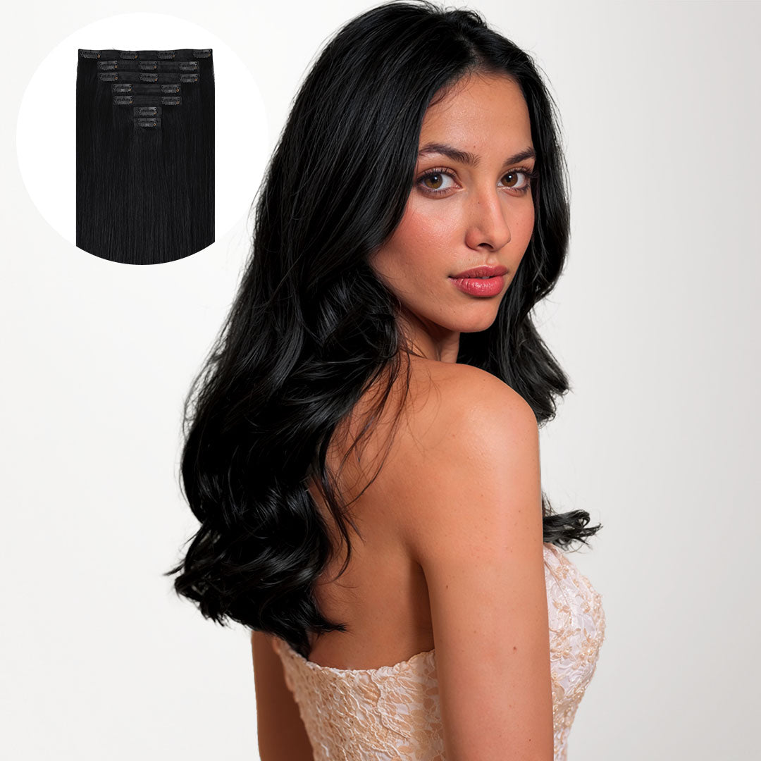 DESCRIPTION –50% thinner & virtually undetectable –Fine & thin hair types –Heat safe & easy to style –Multiple lengths and shades –100% Remy human hair WEIGHT LENGTH TOTAL PIECES CLIN-IN SET INCLUDES 130G 14” 9 1PC 4-Clip Weft – 8 Inch 2PCS 3-Clip Wefts – 6 Inch 4PCS 2-Clip Wefts – 4 Inch 2PCS 1-Clip Wefts – 1.5 Inch 130G 16” 7 1PC 4-Clip Weft – 8 Inch 2PCS 3-Clip Wefts – 6 Inch 2PCS 2-Clip Wefts – 4 Inch 2PCS 1-Clip Wefts – 1.5 Inch 130G 18” 7 1PC 4-Clip Weft – 8 Inch 2PCS 3-Clip Wefts – 6 Inch 2PCS 2-Clip Wefts – 4 Inch 2PCS 1-Clip Wefts – 1.5 Inch 150G 20” 7 1PC 4-Clip Weft – 8 Inch 2PCS 3-Clip Wefts – 6 Inch 2PCS 2-Clip Wefts – 4 Inch 2PCS 1-Clip Wefts – 1.5 Inch 150G 22” 7 1PC 4-Clip Weft – 8 Inch 2PCS 3-Clip Wefts – 6 Inch 2PCS 2-Clip Wefts – 4 Inch 2PCS 1-Clip Wefts – 1.5 Inch GOO GOO Hair Seamless clip in hair extensions are 50% thinner at the top and sit flush against the scalp. Seamless clip in hair extensions are the ideal solution if your hair is very fine, thin and has a difficult time concealing traditional clip in hair extensions.This lay-flat design is invisible, discreet and won’t damage your hair. GOO GOO Hair Seamless Clip in hair extensions have comfortable-wear clips that keep your natural hair damage-free, with no bulk, just natural-looking volume and length. It is designed in the same seven-piece weft design as our classic clip in hair extensions. These gorgeous seamless extensions come in all of our multi-tonal shades for instant volume and length at a moment’s notice. VIDEO TUTORIAL How to Wear Seamless Clip in Hair Extensions? Step 1- Prepare the hair wefts, Open the clips that are sewed on the weft, Separate your hair. Step 2- Starting at the lower back section of your head, use a tail comb or index finger to divide(horizontally part)your hair, at the lower back of the head i.e. just below one ear to the second ear. Also, you can start parting even lower, as low as you want to place the first weft. Pick up the clip hair extensions that you need. Step 3- Then repeat 1-2 steps to put the remain pu weft clip in hair extensions in different areas of your head. Step 4- Finally, put down your own hair on the partition to cover the pu hair extensions, and then gently comb the entire hair with a comb. Step 5- Then you will have a beautiful and charming hair looking. SHIPPING & RETURNS Free Shipping Worldwide. All prices on the website include FREE standard shipping to applicable countries. You can exchange or refund your order within 30 days.
