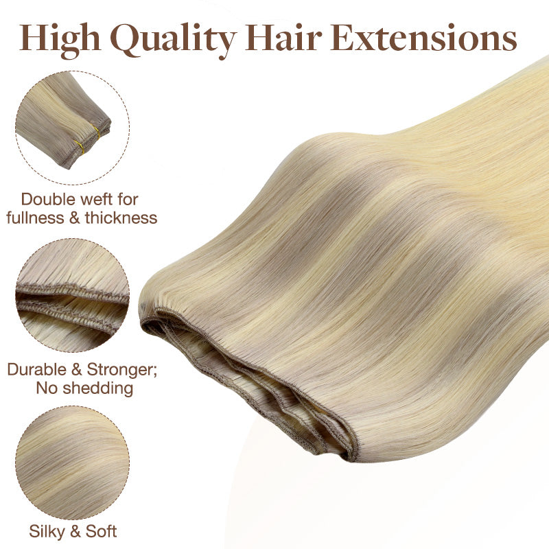 DESCRIPTION Transform your look with GOO GOO Hair Weft Hair Extensions, crafted from premium quality human hair. Our extensions offer a seamless and glamorous solution for adding length and volume to your natural locks. Available in a range of lengths from 14 to 22 inches, these extensions blend effortlessly with your own hair, creating a flawless and natural appearance. Elevate your style and turn heads with GOO GOO Hair Weft Hair Extensions – the ultimate secret to irresistible, show-stopping hair. –100% human remy hair – can be re-applied –Easy to apply in under 30 minutes –Long-lasting Durability, USA-made adhesive long-lasting to 6 months –NON-damaging, lightweight, and comfortable in the hair –Versatile styling options, can be curled, straightened, and styled –Suitable for all hair types WEIGHT LENGTH TOTAL PIECES 80G 14” 1 100G 16” 1 100G 18” 1 100G 20” 1 110G 22” 1 VIDEO TUTORIAL How to wear sew in weft hair extensions? Step 1- Hair extensions must be applied to washed clean hair. Part your hair in desired area where extension needs to be applied. Step 2- Divide your hair into sections horizontally from ear to ear, creating a top and bottom section. Clip the top section away to keep it separate. Step 3- Take a thin section of your natural hair from the bottom section and braid it tightly against your scalp. This serves as the foundation for sewing in the extensions. Step 4- Measure the weft hair extension against the back of your head, from one side to the other. Cut the weft to match the width of the section, leaving a small amount of extra space on each end. Step 5- Thread a needle with a strong, matching thread. Starting at one end of the weft, sew through the weft and the braided section of your hair, going from one side to the other. Secure the weft by looping the thread around the braid and knotting it tightly. Repeat this process along the entire width of the weft, sewing it securely to your braids. Step 6- Please Note: Take care of your sew-in hair extensions by washing and conditioning them regularly using mild, sulfate-free products. Avoid excessive heat styling and use heat protectant products to prolong the lifespan of the extensions. Three Different Ways to Install: How to Remove Weft Hair Extensions? Step 1- Gather a pair of small scissors, a seam ripper, and a wide-toothed comb. These tools will help you safely remove the sew-in extensions. Step 2- Begin by identifying the thread used to sew in the extensions. It is usually a different color from your natural hair and may be visible near the roots of the extensions. Using the small scissors or seam ripper, carefully cut the thread along the weft of the extensions. Take your time to avoid cutting your natural hair. Step 3- Once the thread is cut, gently pull the weft away from your natural hair, starting from one end and working your way to the other. If the weft is tightly sewn, use the seam ripper to carefully undo the stitching. Step 4- After removing each weft, use a wide-toothed comb to gently detangle any knots or tangles that may have formed during the removal process. Start from the ends and work your way up to the roots. How To Wash Comb your hair with a wide-tooth comb. Wash your hair extensions with warm water and sulfate free conditioner. Wash your hair by holding gently. Do not rub your hair. Comb your hair extensions with a wide-tooth comb from the bottom to the top of the hair extensions. Gently hold the hair with your hand and squeeze the water. Beat the hair with a towel until the hair is dry. Kindly Reminder: Please do not use colored shampoos (such as purple shampoo), to wash very light colored hair extensions. Because this may stain the hair extensions. SHIPPING & RETURNS Free Shipping Worldwide. All prices on the website include FREE standard shipping to applicable countries. You can exchange or refund your order within 30 days. *Hope you could understand that if your order is out of stock in the warehouse, we will ship it directly from the factory. Usually takes 3-5 business days to deliver. FAQ 1. Is GOO GOO hair 100% human hair? Yes, GOO GOO Hair is made from 100% remy human hair. We take pride in providing our customers with high-quality hair extensions that are sourced ethically and made from genuine human hair. Our hair extensions undergo a rigorous process to ensure that they are of the highest standard.2. Can I dye/color my Weft Hair Extensions?Human hair can be coloured, but we do not recommend it. Any colouring of the hair extensions is done entirely at your own risk. GOO GOO will not accept any liability for hair extensions that have been coloured or tinted.3. Can I heat my Weft Hair Extensions?Keep in mind that use of heat styling and other hair products will cause damage to your extensions over time. Do not leave on heat for extended time periods, extensions can burn just like your own hair.
