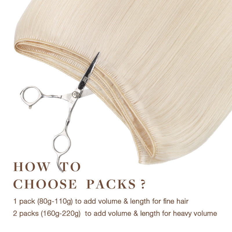 DESCRIPTION Transform your look with GOO GOO Hair Weft Hair Extensions, crafted from premium quality human hair. Our extensions offer a seamless and glamorous solution for adding length and volume to your natural locks. Available in a range of lengths from 14 to 22 inches, these extensions blend effortlessly with your own hair, creating a flawless and natural appearance. Elevate your style and turn heads with GOO GOO Hair Weft Hair Extensions – the ultimate secret to irresistible, show-stopping hair. –100% human remy hair – can be re-applied –Easy to apply in under 30 minutes –Long-lasting Durability, USA-made adhesive long-lasting to 6 months –NON-damaging, lightweight, and comfortable in the hair –Versatile styling options, can be curled, straightened, and styled –Suitable for all hair types WEIGHT LENGTH TOTAL PIECES 80G 14” 1 100G 16” 1 100G 18” 1 100G 20” 1 110G 22” 1 VIDEO TUTORIAL How to wear sew in weft hair extensions? Step 1- Hair extensions must be applied to washed clean hair. Part your hair in desired area where extension needs to be applied. Step 2- Divide your hair into sections horizontally from ear to ear, creating a top and bottom section. Clip the top section away to keep it separate. Step 3- Take a thin section of your natural hair from the bottom section and braid it tightly against your scalp. This serves as the foundation for sewing in the extensions. Step 4- Measure the weft hair extension against the back of your head, from one side to the other. Cut the weft to match the width of the section, leaving a small amount of extra space on each end. Step 5- Thread a needle with a strong, matching thread. Starting at one end of the weft, sew through the weft and the braided section of your hair, going from one side to the other. Secure the weft by looping the thread around the braid and knotting it tightly. Repeat this process along the entire width of the weft, sewing it securely to your braids. Step 6- Please Note: Take care of your sew-in hair extensions by washing and conditioning them regularly using mild, sulfate-free products. Avoid excessive heat styling and use heat protectant products to prolong the lifespan of the extensions. Three Different Ways to Install: How to Remove Weft Hair Extensions? Step 1- Gather a pair of small scissors, a seam ripper, and a wide-toothed comb. These tools will help you safely remove the sew-in extensions. Step 2- Begin by identifying the thread used to sew in the extensions. It is usually a different color from your natural hair and may be visible near the roots of the extensions. Using the small scissors or seam ripper, carefully cut the thread along the weft of the extensions. Take your time to avoid cutting your natural hair. Step 3- Once the thread is cut, gently pull the weft away from your natural hair, starting from one end and working your way to the other. If the weft is tightly sewn, use the seam ripper to carefully undo the stitching. Step 4- After removing each weft, use a wide-toothed comb to gently detangle any knots or tangles that may have formed during the removal process. Start from the ends and work your way up to the roots. How To Wash Comb your hair with a wide-tooth comb. Wash your hair extensions with warm water and sulfate free conditioner. Wash your hair by holding gently. Do not rub your hair. Comb your hair extensions with a wide-tooth comb from the bottom to the top of the hair extensions. Gently hold the hair with your hand and squeeze the water. Beat the hair with a towel until the hair is dry. Kindly Reminder: Please do not use colored shampoos (such as purple shampoo), to wash very light colored hair extensions. Because this may stain the hair extensions. SHIPPING & RETURNS Free Shipping Worldwide. All prices on the website include FREE standard shipping to applicable countries. You can exchange or refund your order within 30 days. *Hope you could understand that if your order is out of stock in the warehouse, we will ship it directly from the factory. Usually takes 3-5 business days to deliver. FAQ 1. Is GOO GOO hair 100% human hair? Yes, GOO GOO Hair is made from 100% remy human hair. We take pride in providing our customers with high-quality hair extensions that are sourced ethically and made from genuine human hair. Our hair extensions undergo a rigorous process to ensure that they are of the highest standard.2. Can I dye/color my Weft Hair Extensions?Human hair can be coloured, but we do not recommend it. Any colouring of the hair extensions is done entirely at your own risk.GOO GOO will not accept any liability for hair extensions that have been coloured or tinted.3. Can I heat my Weft Hair Extensions?Keep in mind that use of heat styling and other hair products will cause damage to your extensions over time. Do not leave on heat for extended time periods, extensions can burn just like your own hair.